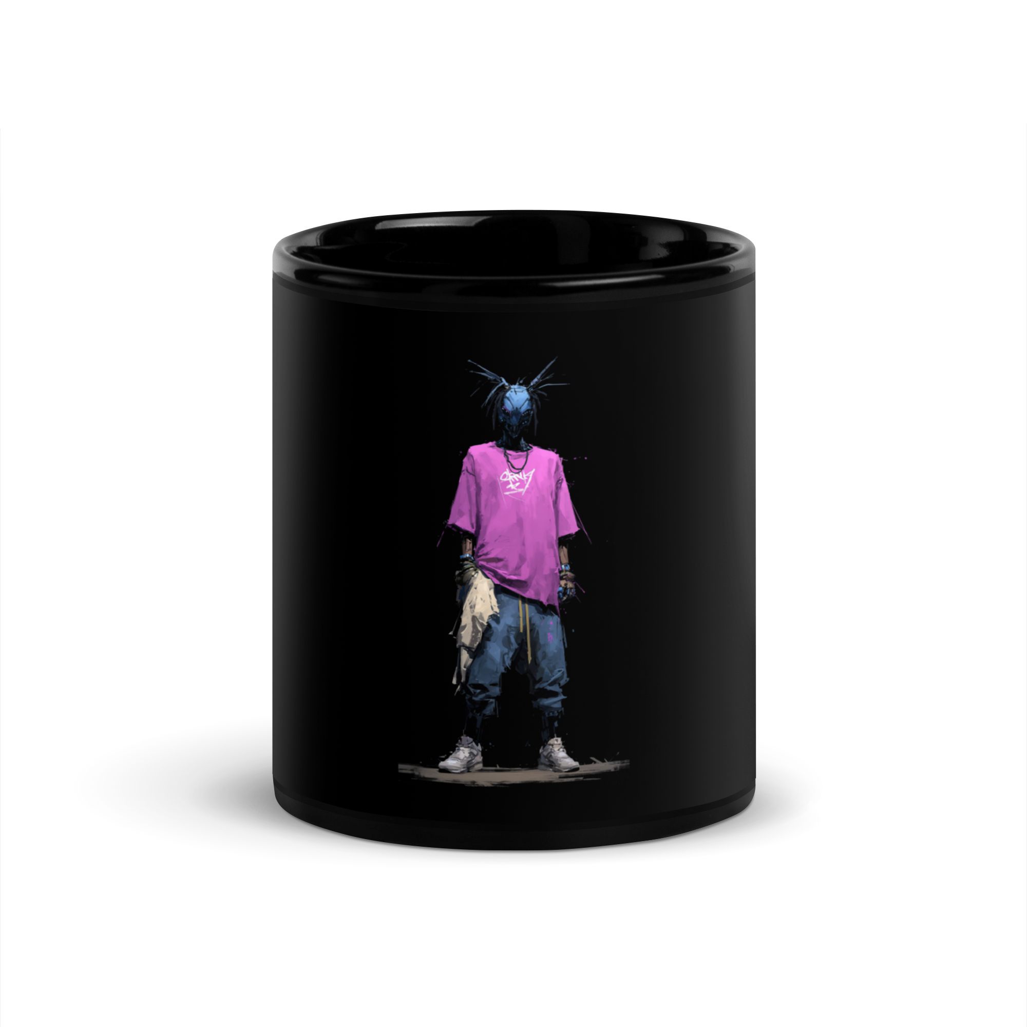A striking ceramic mug featuring the COLLECTORS EDITION "PUNKDROID #002" artwork by Akinsa. Each mug also features the Akinsa signature printed on the side, marking the work as part of the Kiritsu collection.